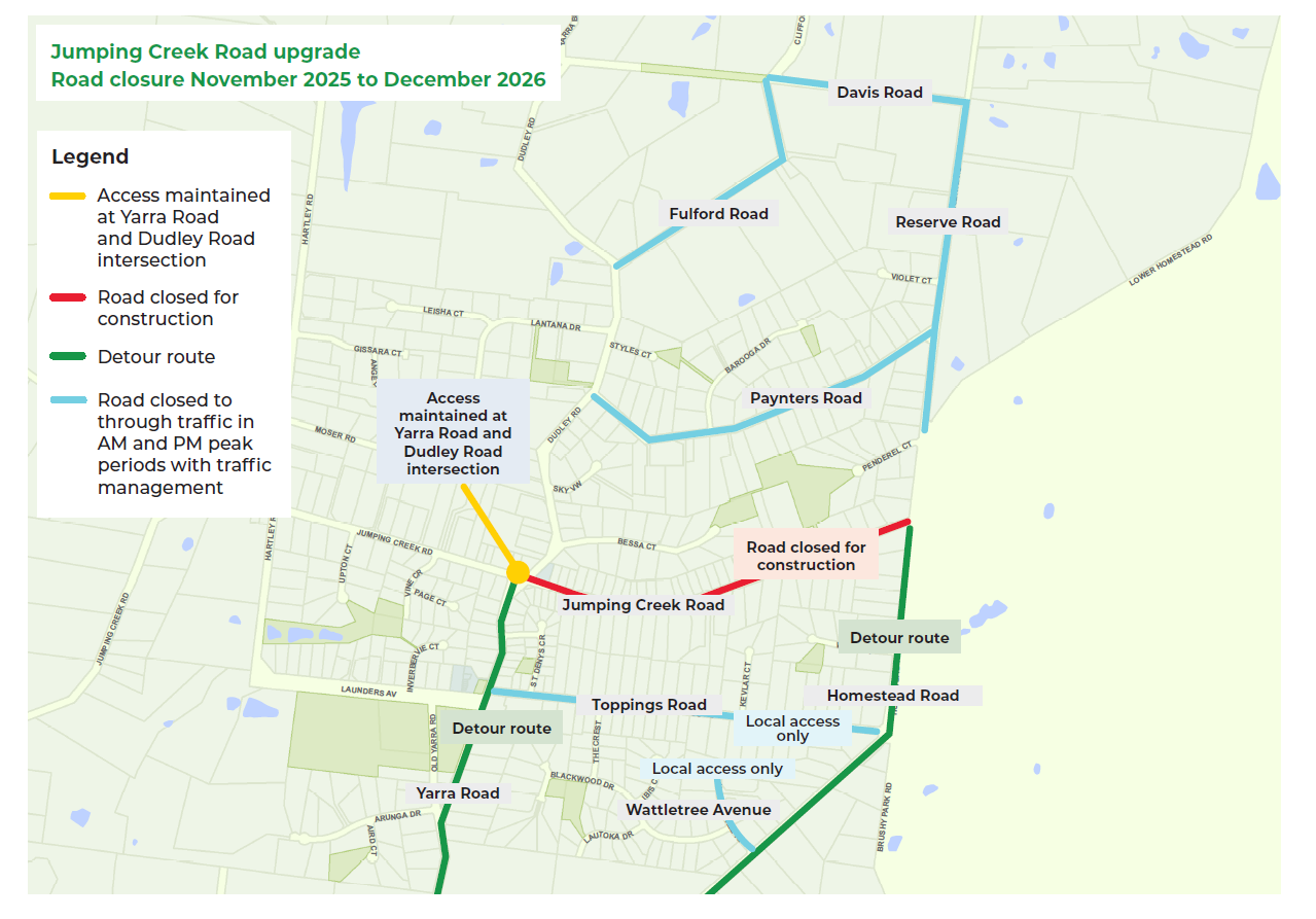 - Requests to ensure pedestrian movement and the school crossing at Jumping Creek Road, Dudley Road and Yarra Road remain available and safe during construction.