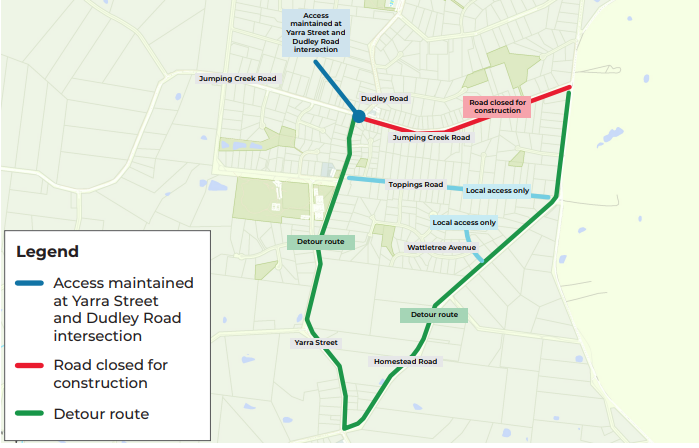 When will the works begin?The first stage of works will begin after Easter and includes the construction of the Yarra Road footpath, along with early site investigations on Jumping Creek Road and Dudley Road. We anticipate some temporary disruptions to the community during these works.